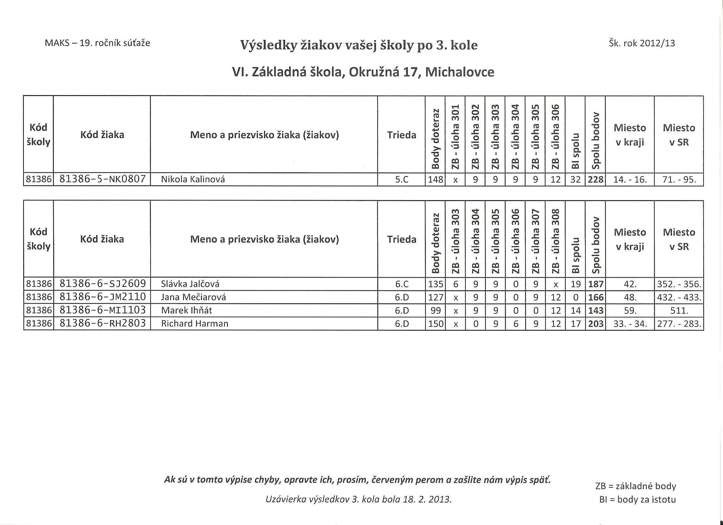 Výsledková listina žiakov našej školy po 3. kole v šk. roku 2012/2013