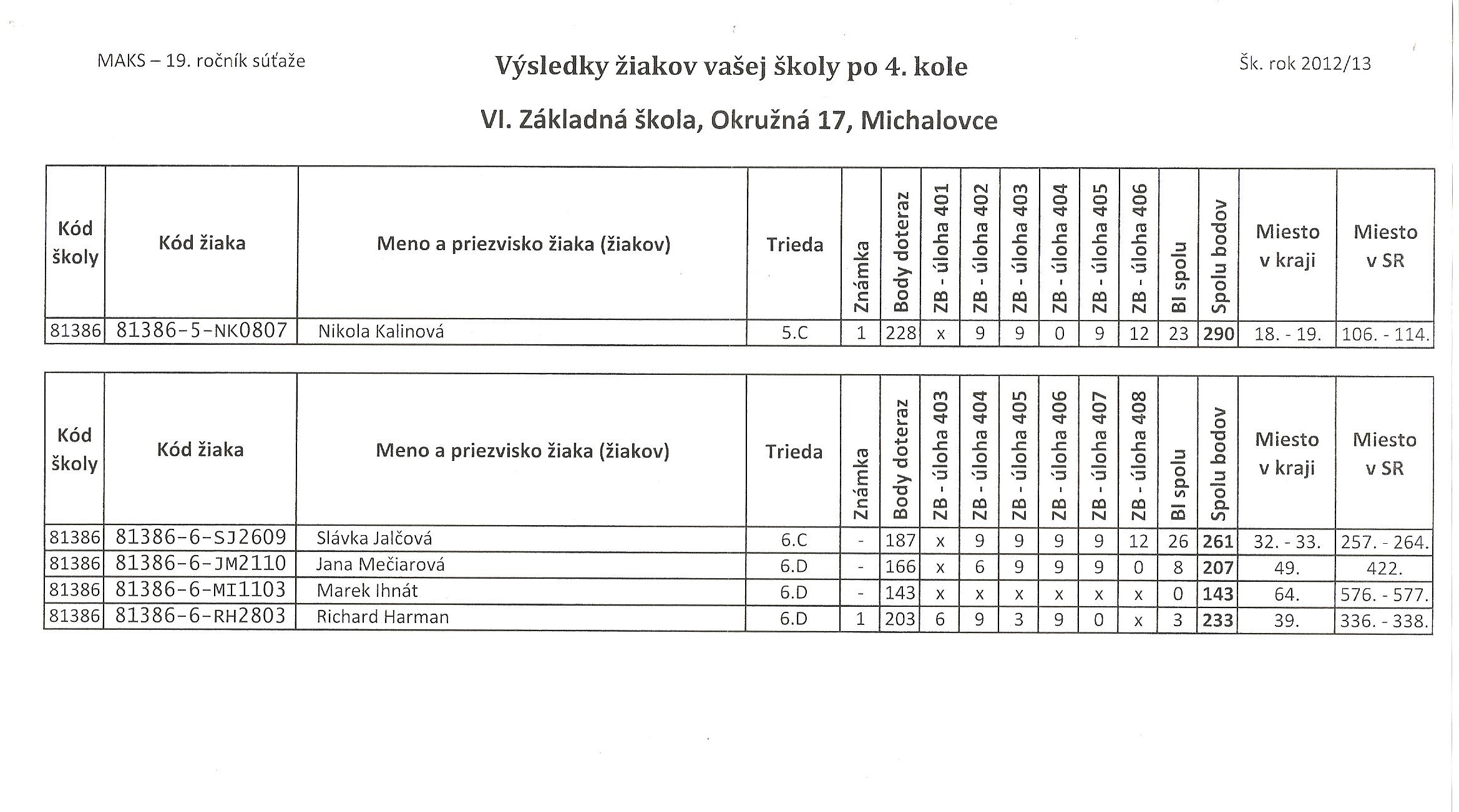 Výsledková listina žiakov našej školy po 4. kole v šk. roku 2012/2013