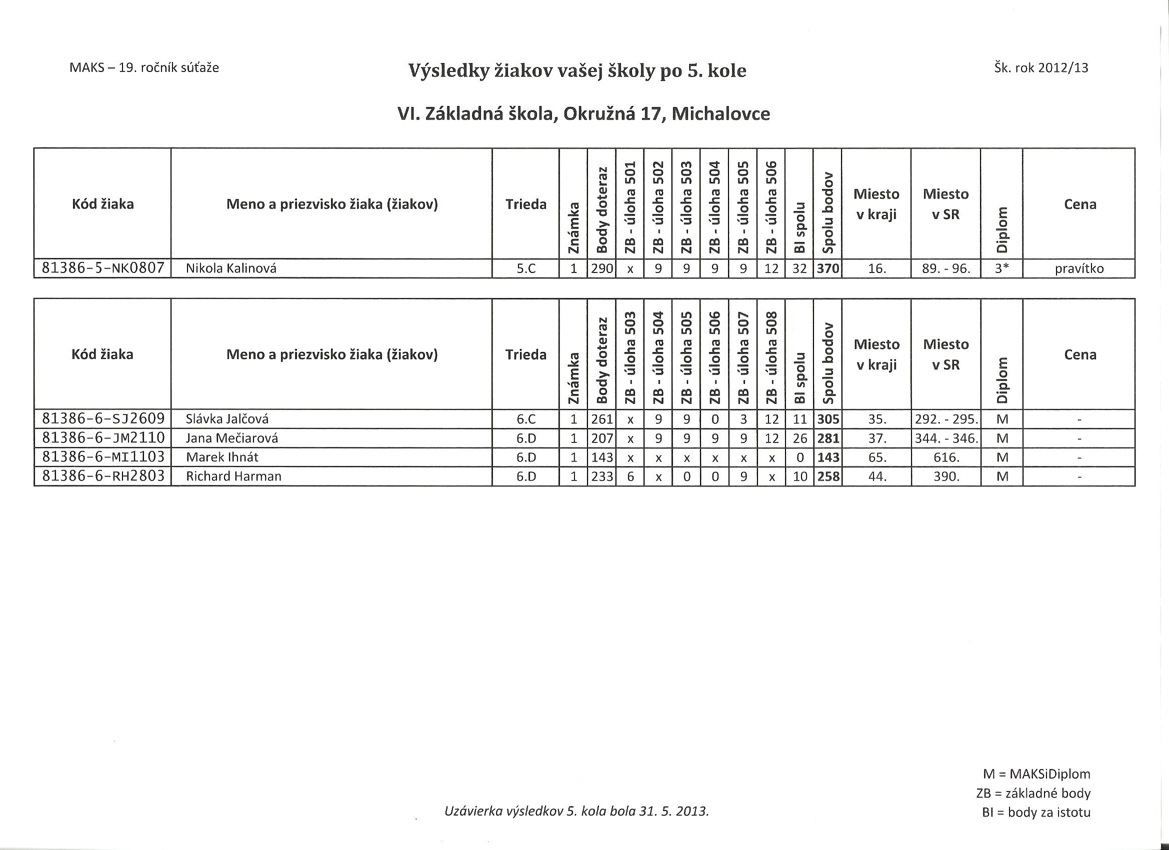 Výsledková listina žiakov našej školy po 5. kole v šk. roku 2012/2013